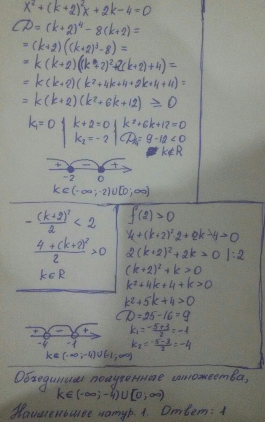 при каком наименьшем натуральном значении k корни уравнения x^2+(k+2)^2 *x+2k-4=0 будут меньше 2