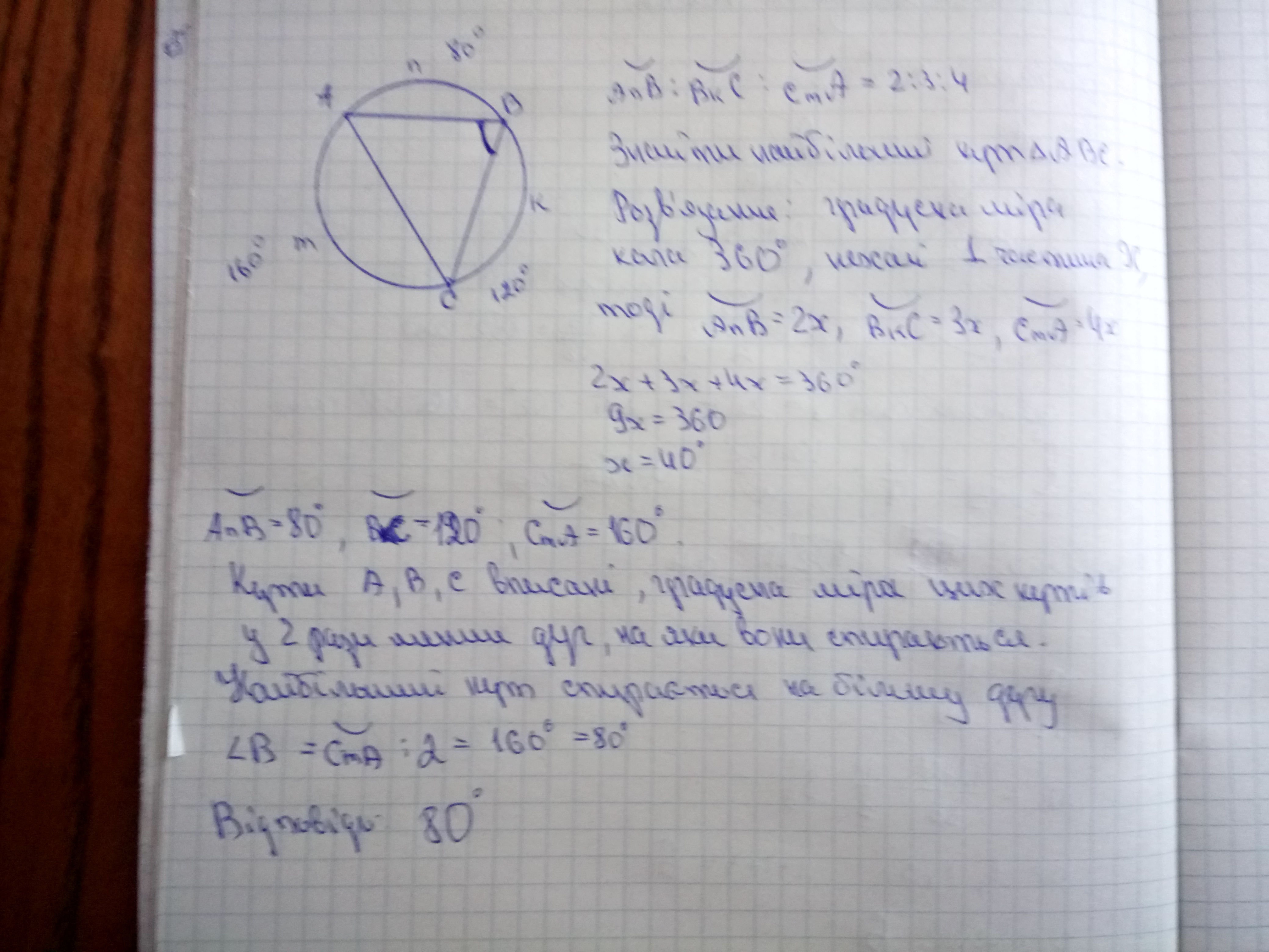 Три точки A,B,C ділять коло на дуги, градусна міра яких відносяться 2:3:4. Знайдіть найбільший кут трикутника ABC