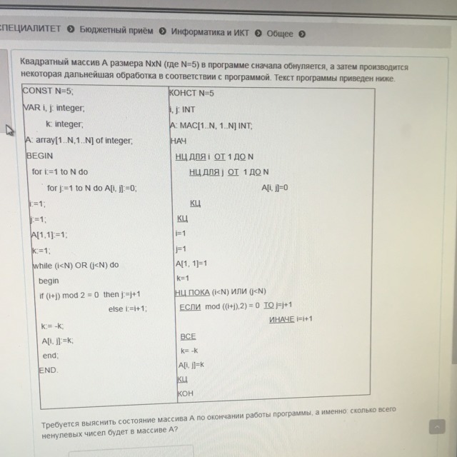 В этом коде, элементы массива обнуляются (A[i,j]=0). После чего, первому элементу присваивается значение 1 (A[i,j]=1).
