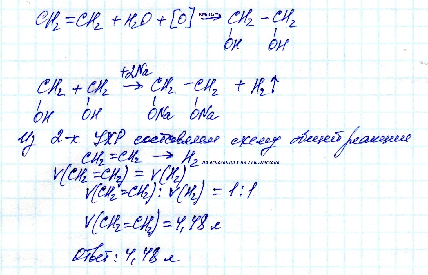 Какой объем этилена было окислено под действием калий перманганата,если конечное вещество реагирует с металлическим натрием с выделением 4,48 л водорода?