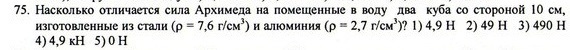 Fа = po(воды)*g*V, так как объем кубов алюминия и стали одинаков и равен 10^3 см^3 то и архимедова сила действующая на эти кубы будет одинакова.