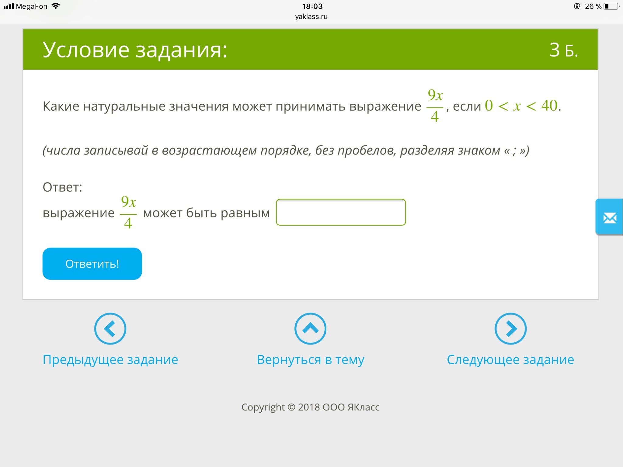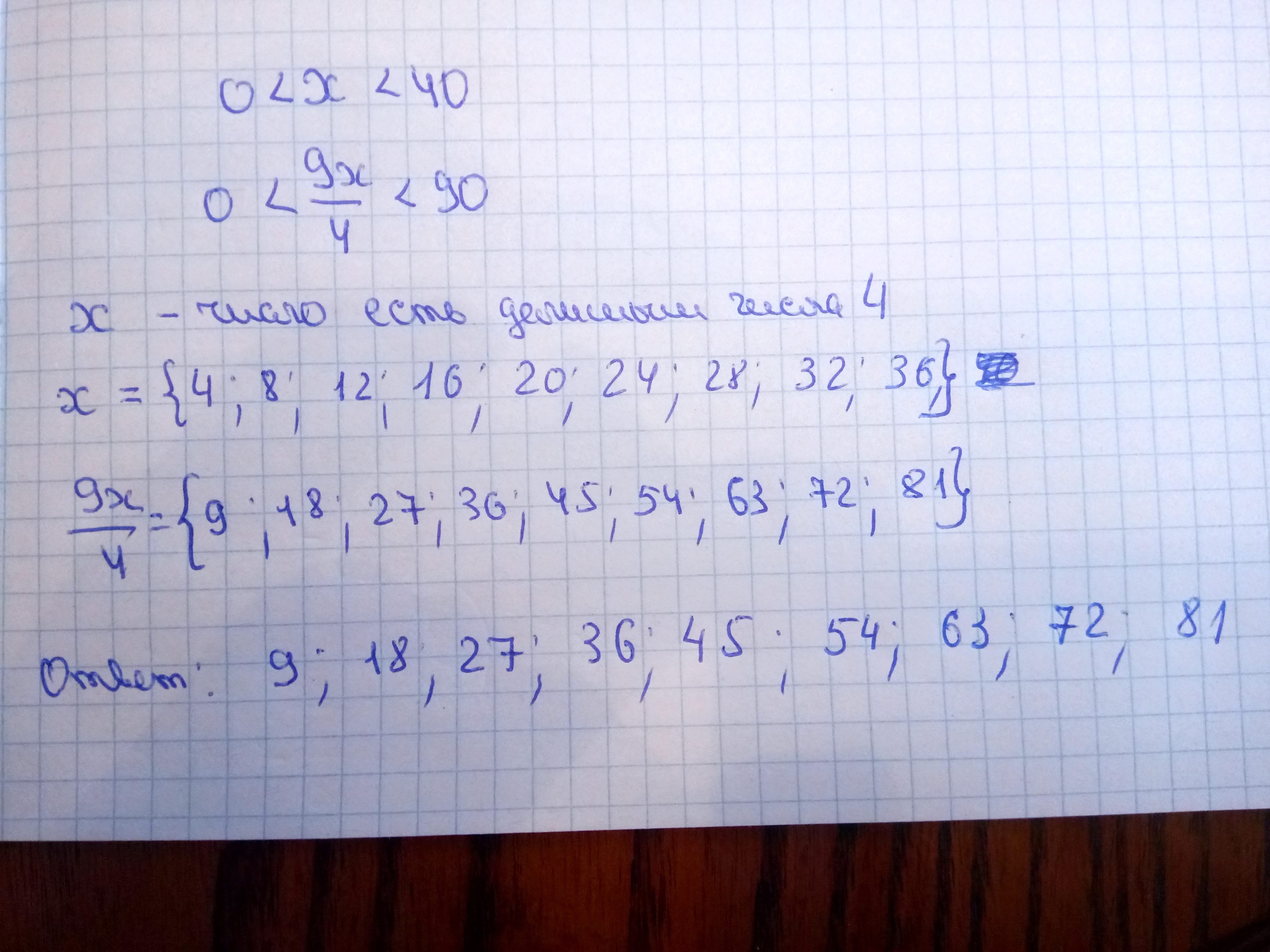 Перебираем иксы, которые нацело делятся на 4 (либо сокращаются вместе с 9/4 до целого числа) и получаем: 1;2;3;4;5;6;7;8;9;18;27;36;45;54;63;72;81