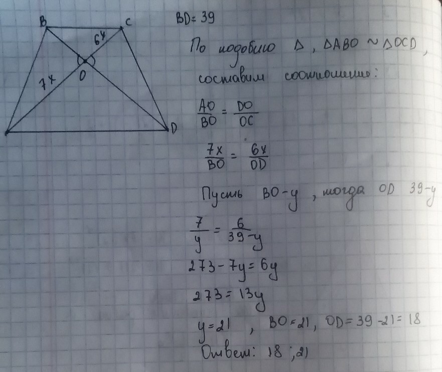 Известно, что O - точка пересечения диагоналей АС и ВД трапеции АВСД (ВС \ АД). Найдите длины отрезков ВО и 0Д, если АО: ОС = 7: 6 и ВД = 39 см.