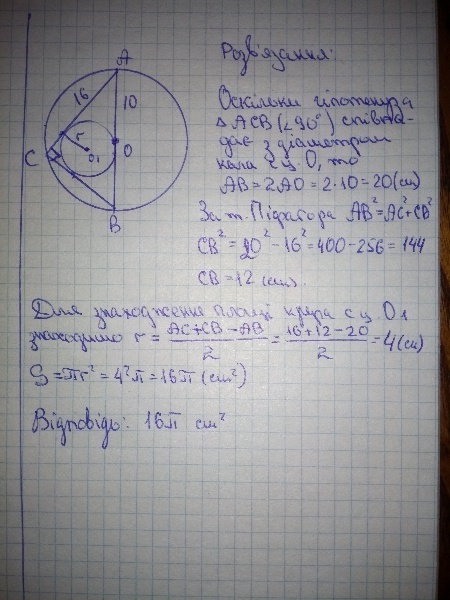 радіус кола описаного навколо прямокутного трикутника дорівнює 10 см ,а катет -16см Знайдіть площу круга вписаного в цей трикутник