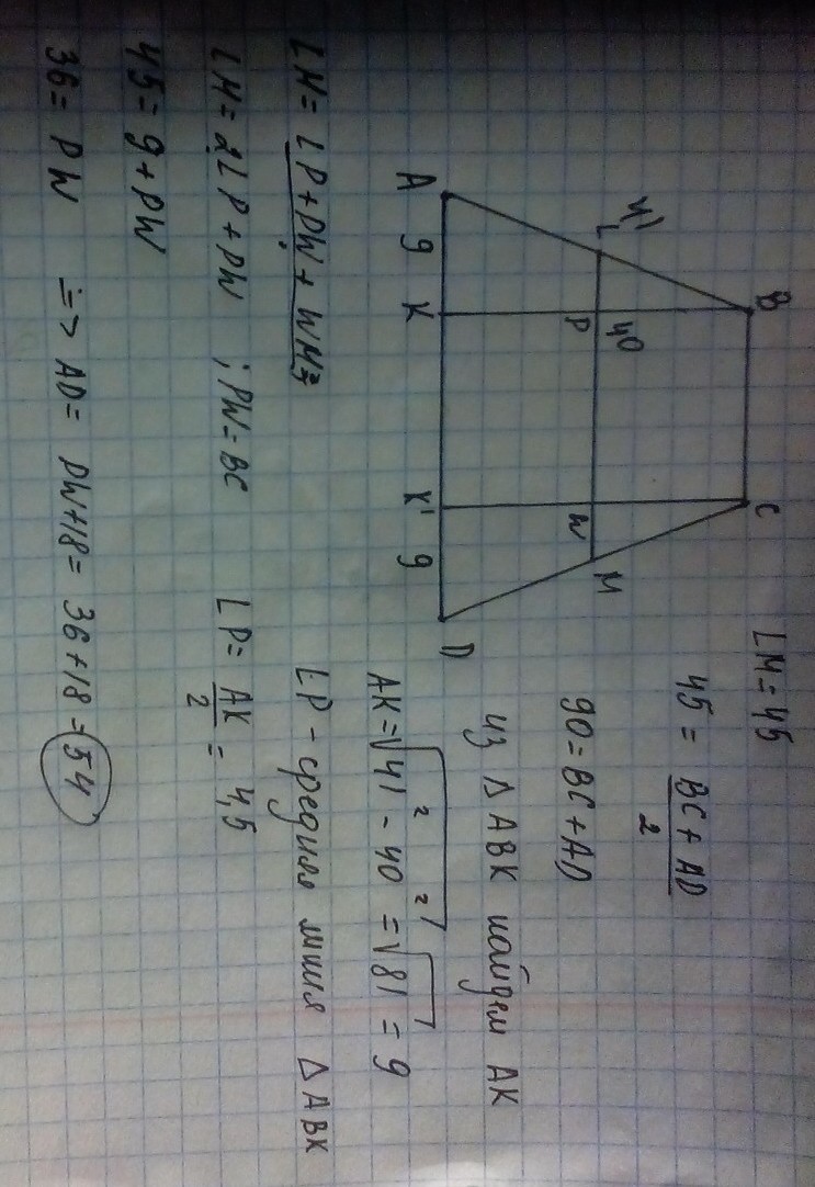 В равнобедренной трапеции боковая сторона 41 см, высота 40 см, а средняя линия 45 см. Найти основания трапеции