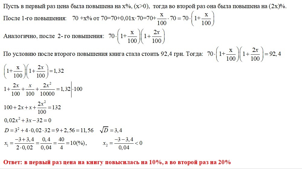 Цена книги повышалась дважды, при этом процент повышения во второй раз, был в два раза больше, чем в первый. Определить, на сколько процентов повышалась цена книги в каждый из разов, если до первого повышения она составляла 70грн, а после второго - 92 грн 40 к.