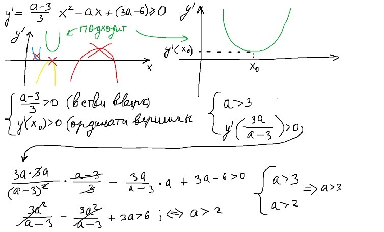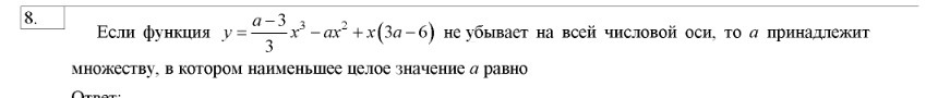 Если функция у=((а-3)/3)*х^3-a*x^2+x(3a-6) не убывает по всей числовой оси,то а принадлежит множеству, в котором наименьшее целое значение числа а равно?