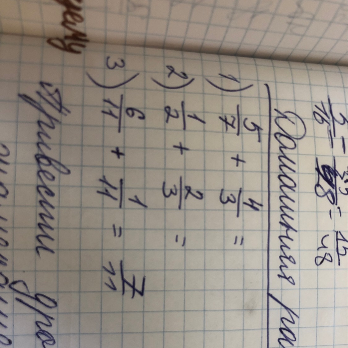 1)frac{5}{7}+frac{4}{3}=frac{5*3}{21}+frac{4*7}{21}=frac{15}{21}+frac{28}{21}=frac{15+28}{21}=frac{43}{21}=2frac{1}{21}  \ \ \  <br />2)frac{1}{2}+frac{2}{3}=frac{1*3}{6}+frac{2*2}{6}=frac{3}{6}+frac{4}{6}=frac{7}{6}=1frac{1}{6}