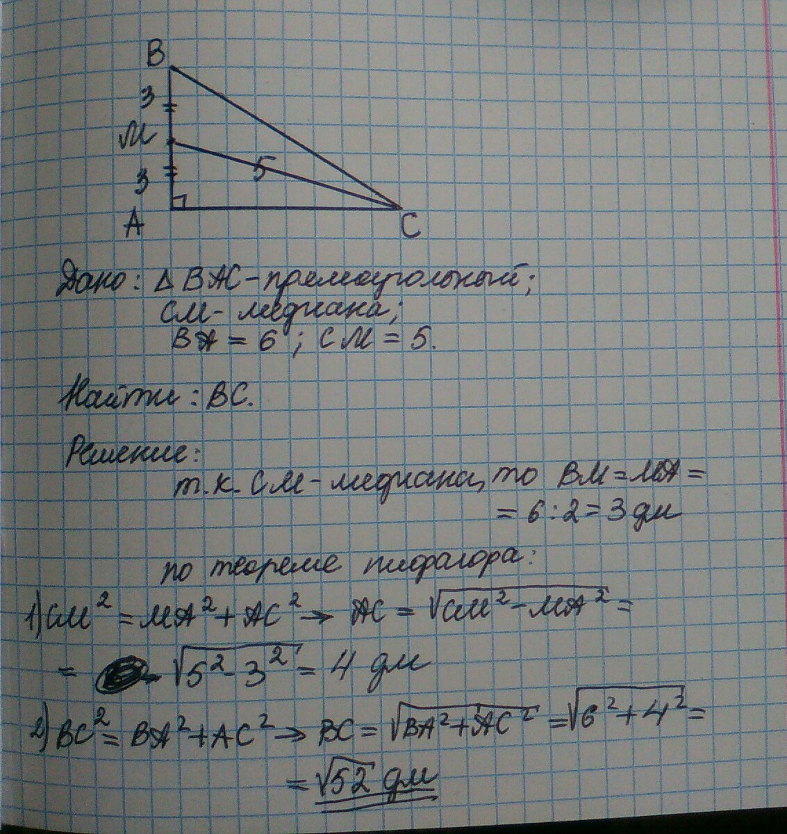 один катет прямоугольного треугольника 6 дм.Медиана опущенная на этот катет равна 5 дм,найти гепотенузу катета