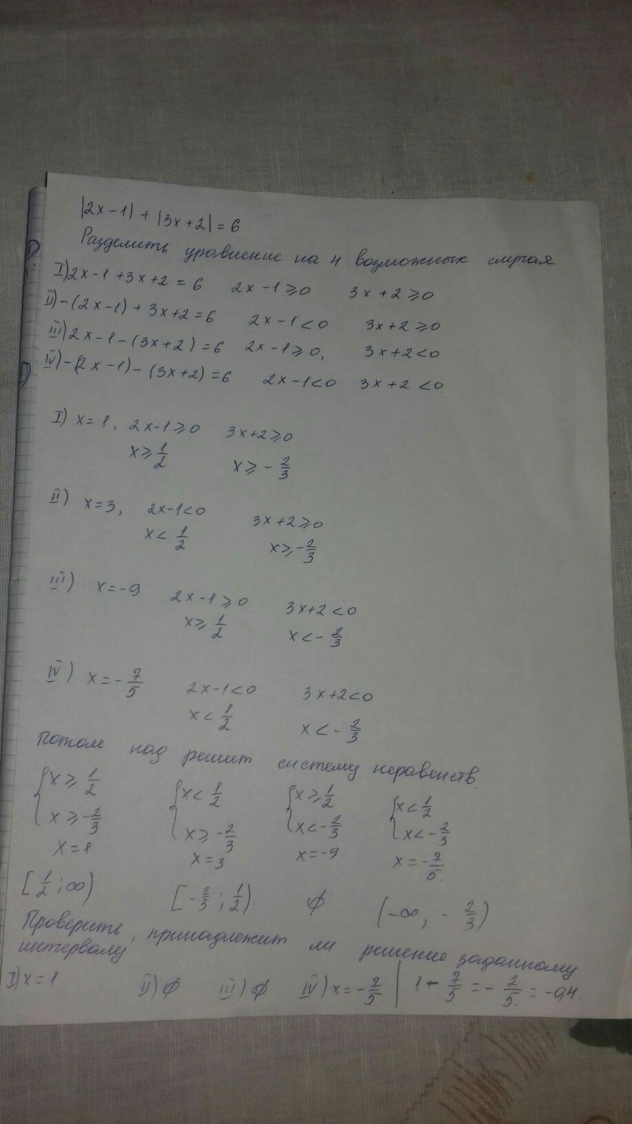 1) 2х-1+3х+2=6 2х-1>ли равно 0 3х+2>ли равно 0