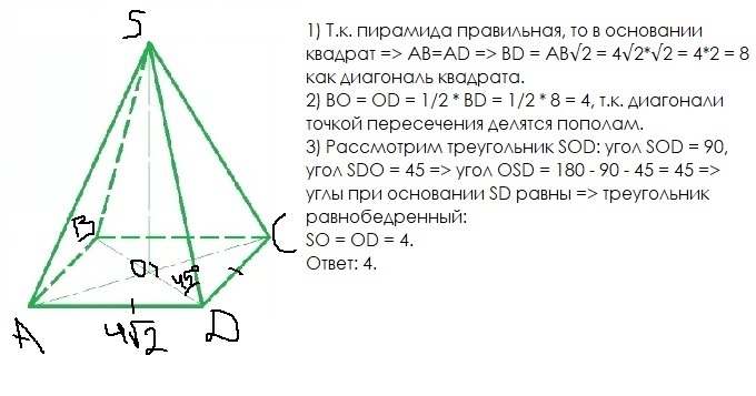 Сторона основания правильной четырехугольной пирамиды равна 4√2, а боковое ребро наклонено к плоскости основанию под углом 45. Найдите высоту пирамиды.
