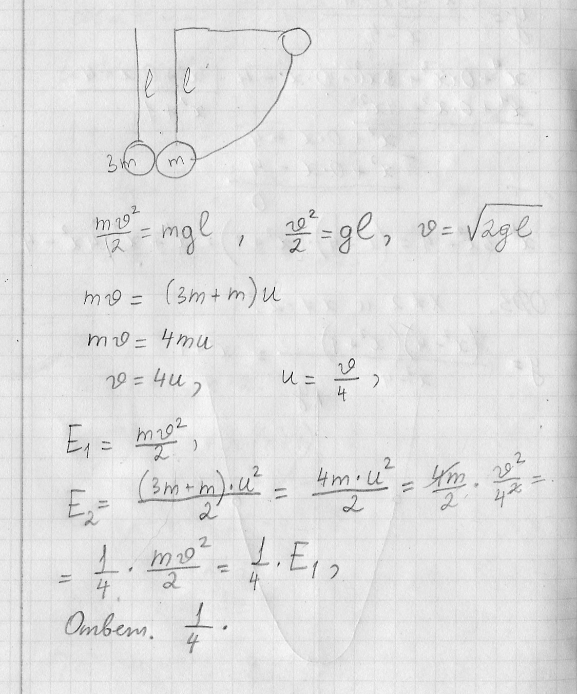 Два шарика, массы которых отличаются в 3 раза, висят, соприкасаясь, на вертикальных нитях. Лёгкий шарик отклоняют на угол 90 и отпускают из состояния покоя, и он абсолютно НЕУПРУГО сталкивается с тяжёлым шариком. Какую часть кинетической энергии лёгкого шарика перед ударом составит кинетическая энергия двух шаров?