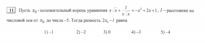 Запишем уравнение в виде x*√x+1/(x*√x)=2-(x-1)². Это уравнение имеет очевидный корень x0=1, и тогда l=/x0-(-5)/=x0+5=6. Отсюда разность 2*x0-l=2*1-6=-4. Ответ: -4