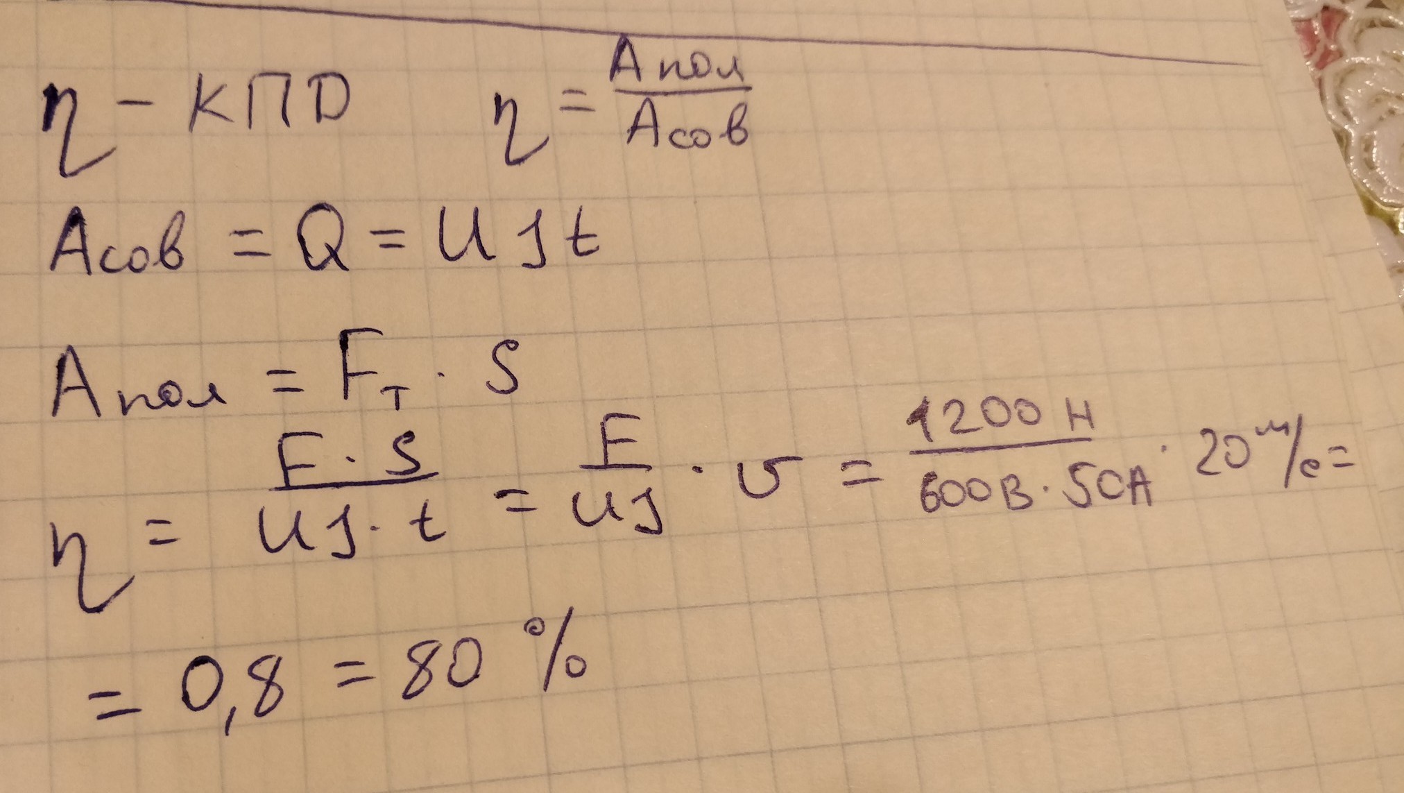 к.п.д.= полезная мощность/затраченная мощность = (1.2*10^3Н*20м/с)/600В*50А =.8 = 80%