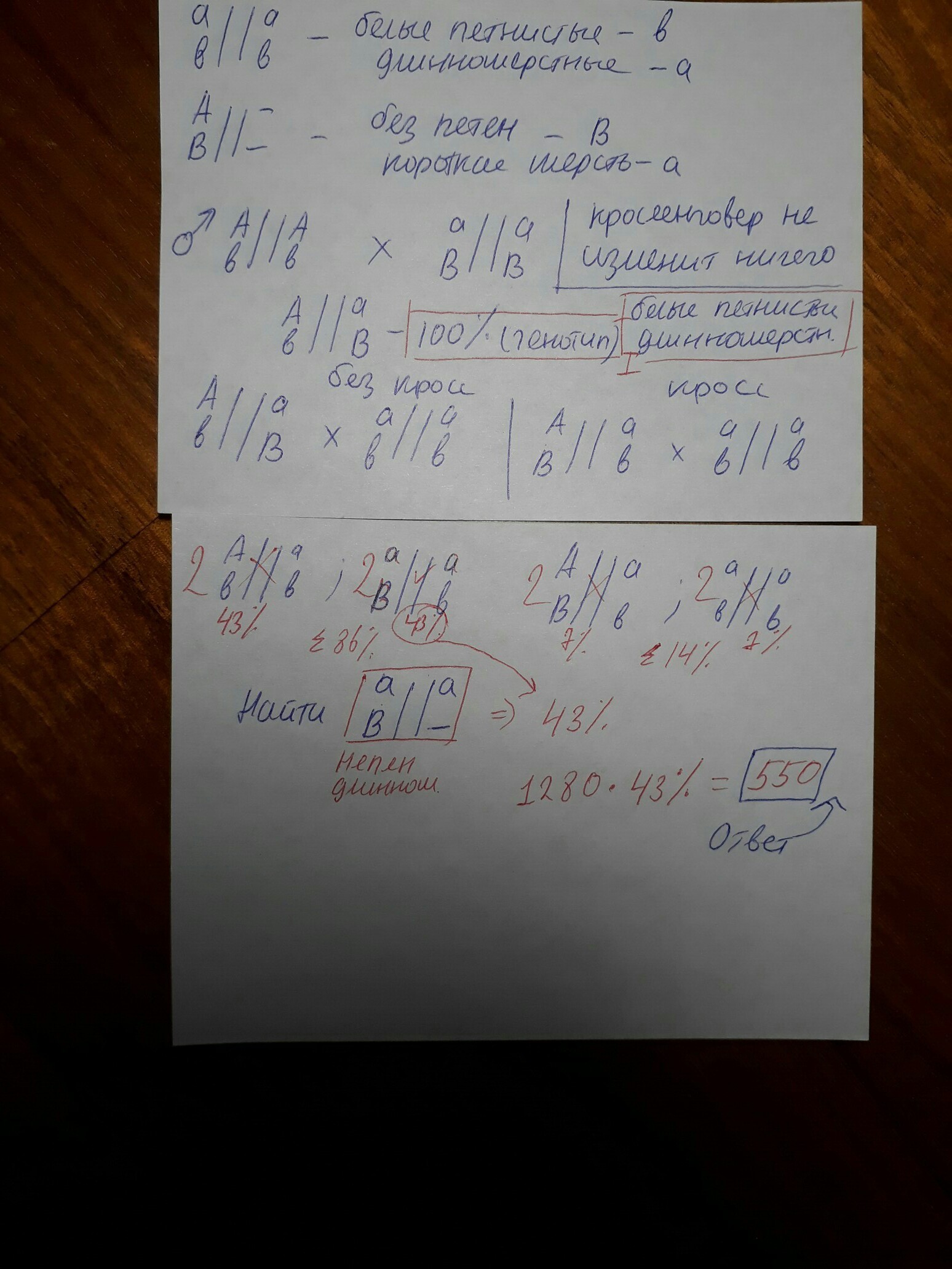 У кроликов рецессивные аллели двух сцепленных генов детерминируют белую пятнистость шерсти и длинношерстность или шерсть ангорского типа , а доминантные - отсутствие пятен на шерсти и короткошерсность. Расстояние между генами равно 14%. Гомозиготного короткошерстного пятнистого кролика скрестили с гомозиготной ангорской непятнистой крольчихой. Какой фенотип и генотип имели гибриды первого поколения? Какое число , теоретически , непятнистых длинношерстных кроликов должно быть среди 1280 потомков от анализирующего скрещивания гибридов первого поколения?