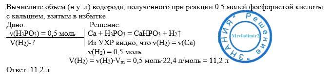Вычислите объем (н.у,л)водорода,полученного при реакции 0.5 молей фосфористой кислоты с кальцием , взятым в избытке