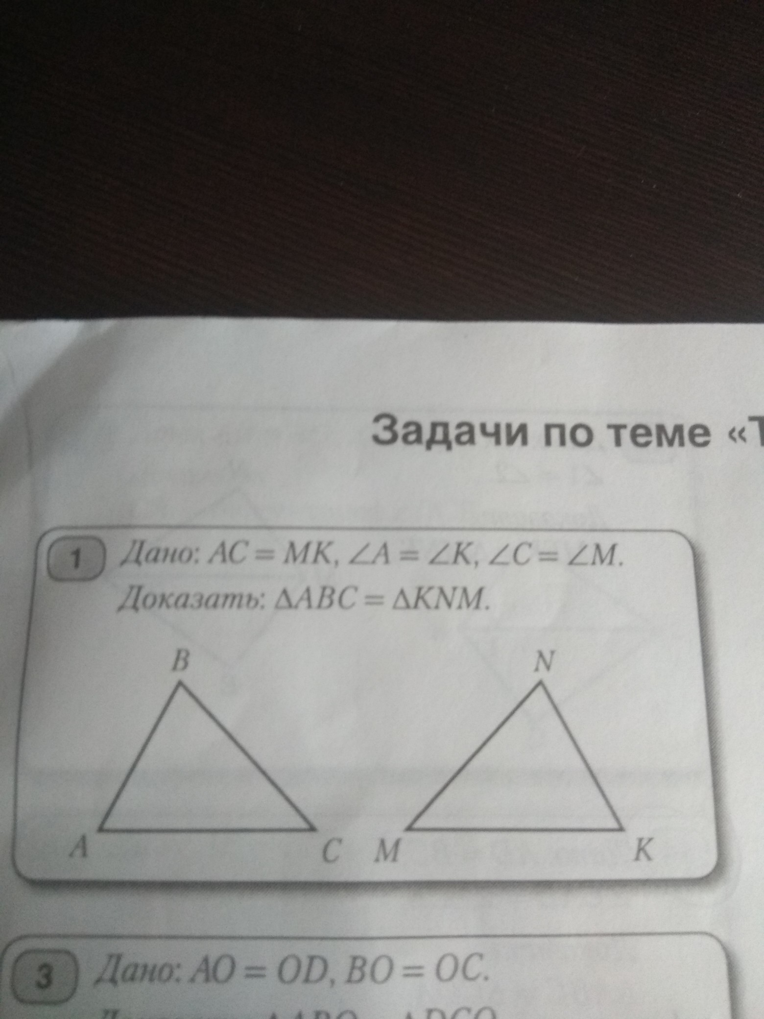 тр.ABC = тр.KNM равны по Второму Признаку Равенству Треугольников: