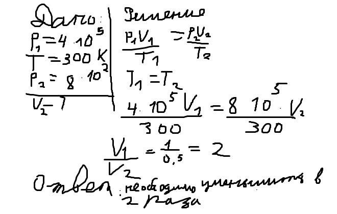 В цилиндрическом сосуде под поршнем находится идеальный газ, давление которого 4*10^5 Па и температура 300 К. Чтобы давление увеличилось до 0,8*10^6 Па необходимо объем газа