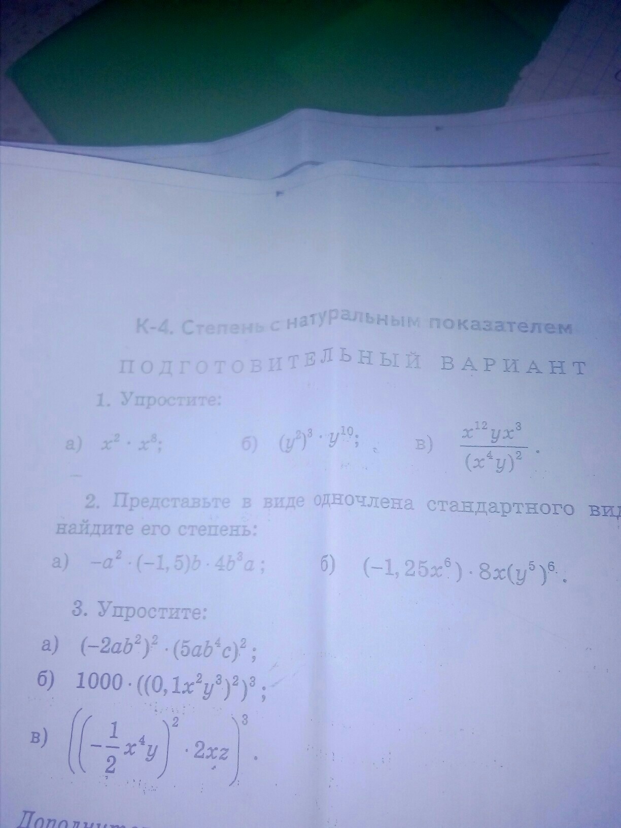 б).1000×((0,1x²y³)²)³=1000×(0,01x⁴y⁶)³= 1000×0,000001x¹²y¹⁸= 10³×10⁻⁶x¹²y¹⁸=10⁻³x¹²y¹⁸= 0,001x¹²y¹⁸