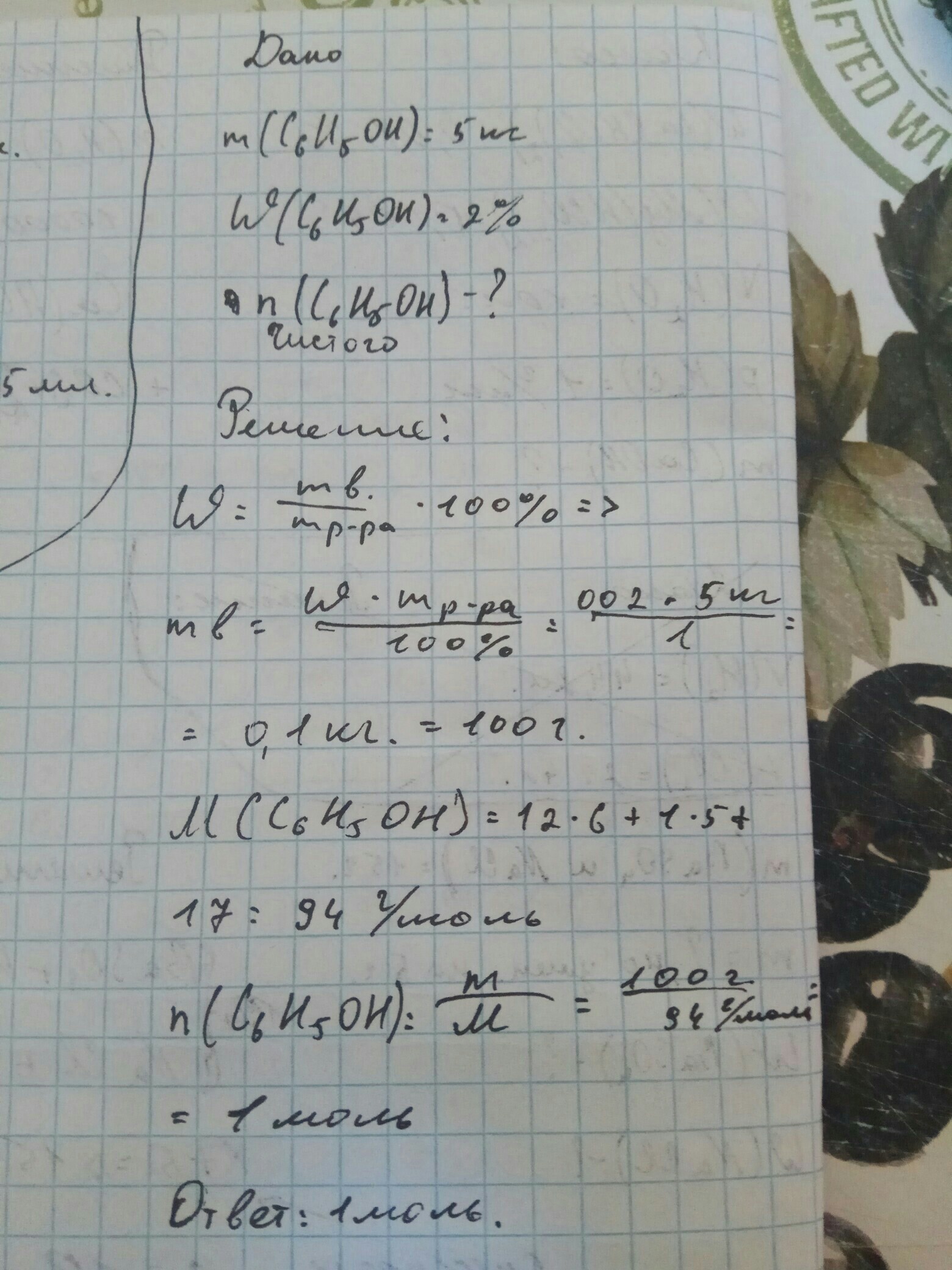 Какое количество чистого фенола нужно взять, чтобы приготовить 5 кг 2%го раствора карболовой кислоты?