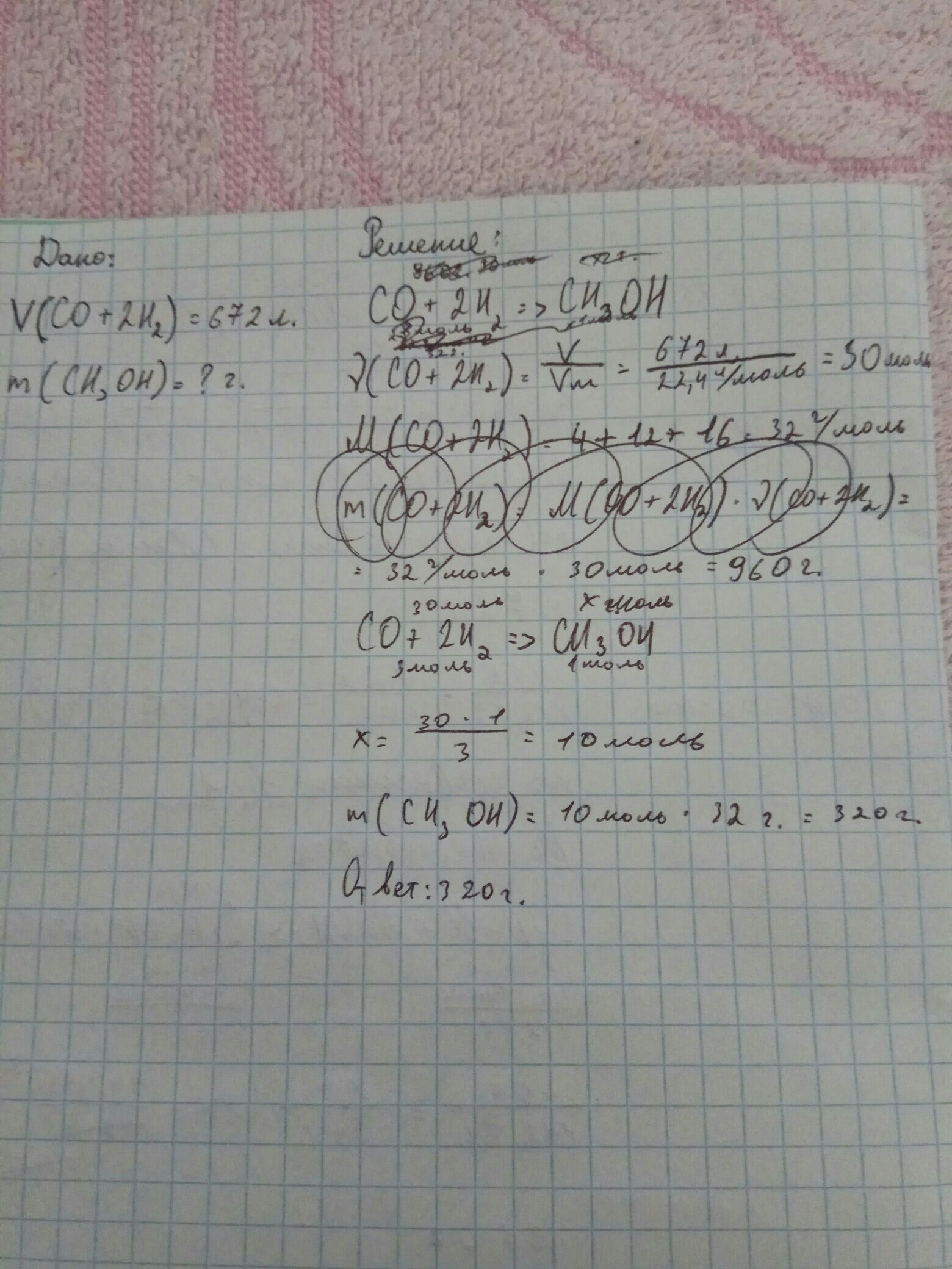 Какую массу метанола можно получить с 672 л водяного газа (co+2h2)? Без понятия, как решать с водяным газом(