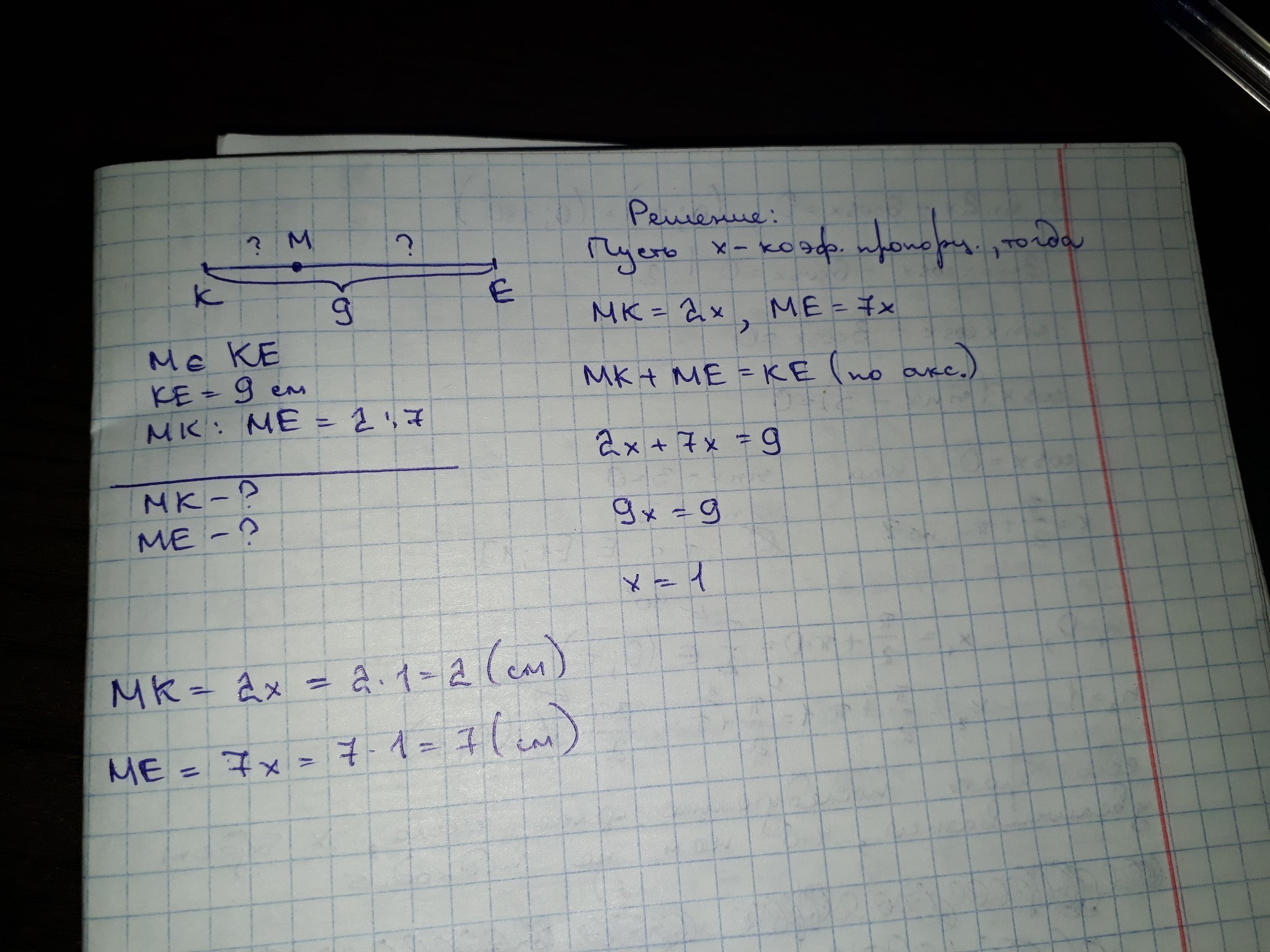 Точка М принадлежит отрезку КЕ длинна которого равна 9см.Определите длины отрезков МК и МЕ если: МК:МЕ = 2:7