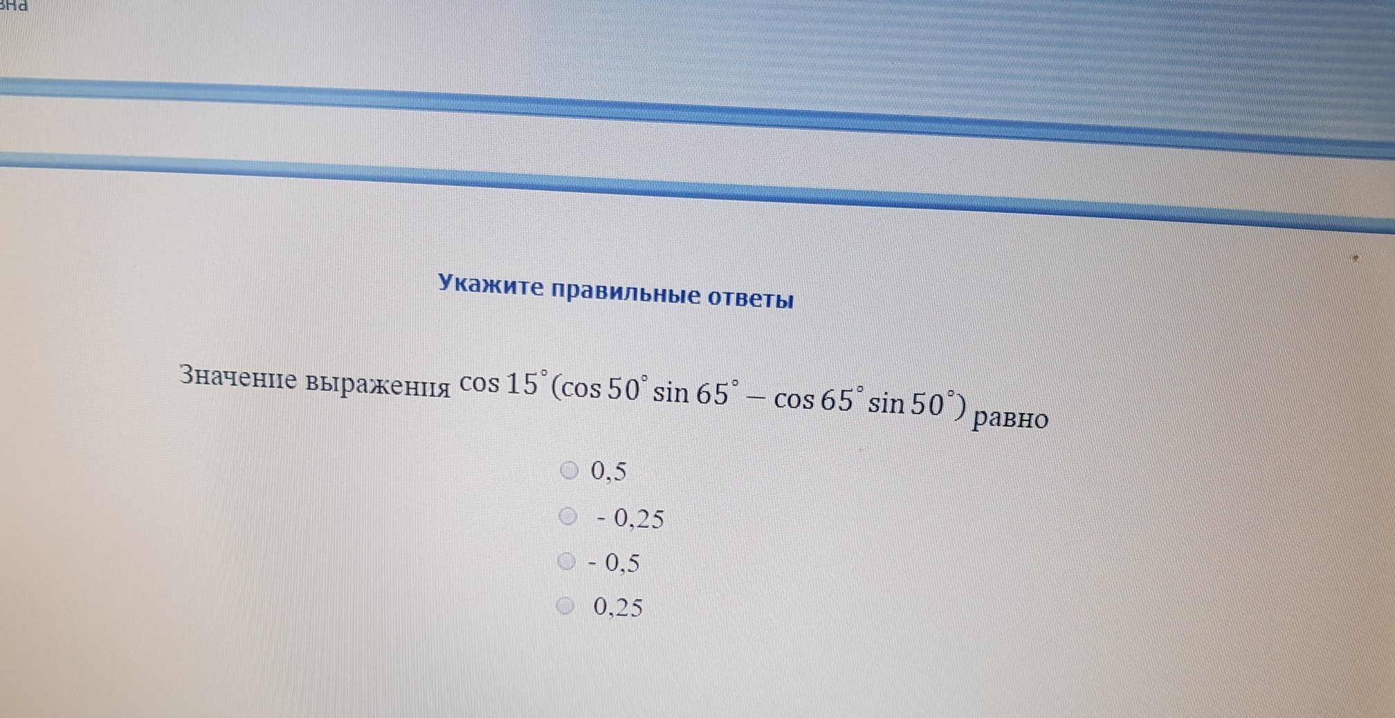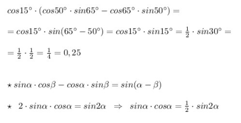 Таким образом, cos15°*sin15°=sin30°/2 (из формулы двойного аргумента)=0,25