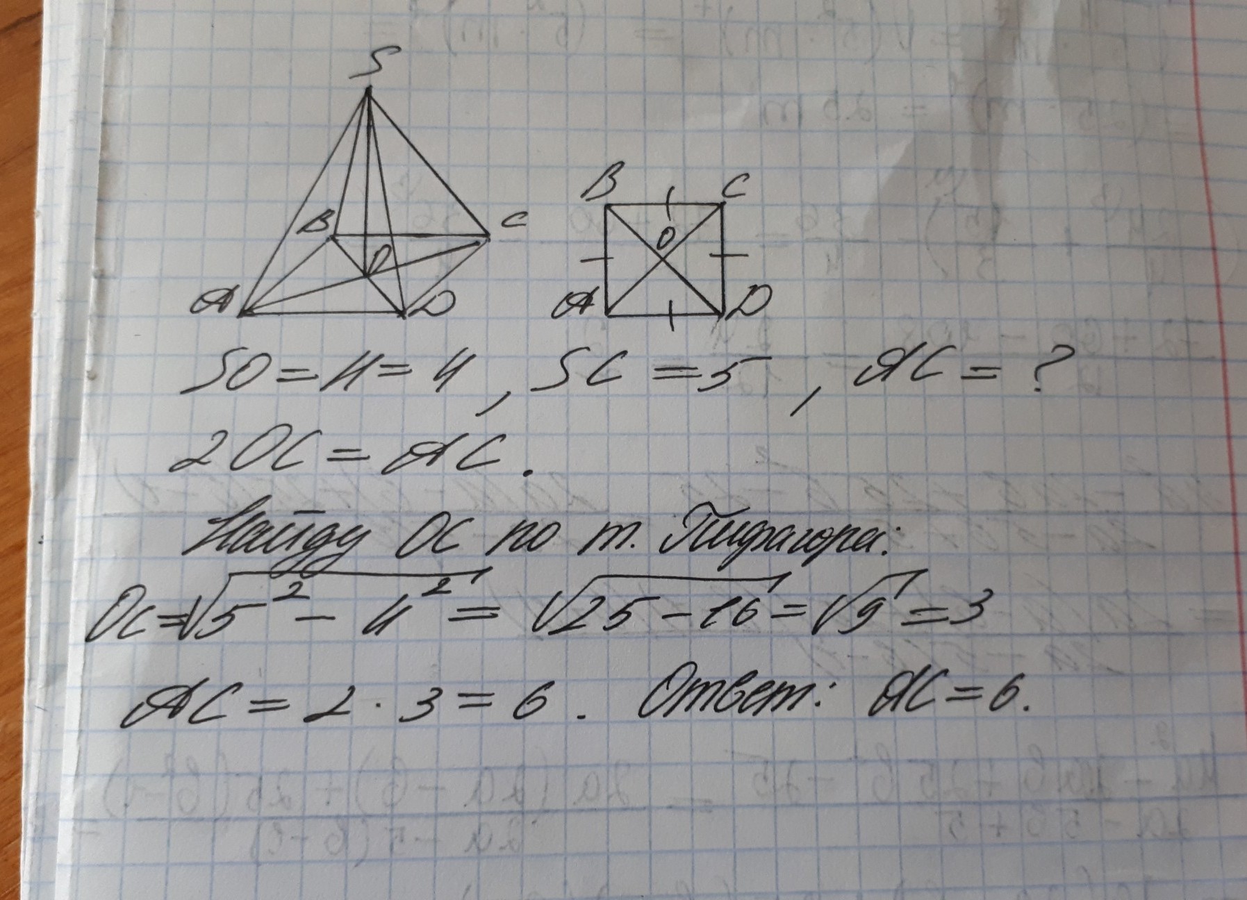 в правильной четырёхугольной пирамиде SABCD точка O - центр основания, S вершина, SO=4, sc=5. Найдите длинну отрезка AC