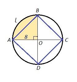 У коло з центром O вписанот квадрат ABCD. Знайти довжину дуги кола, яка відповідає куту AOB, якщо радіус кола дорівнює 8 см.