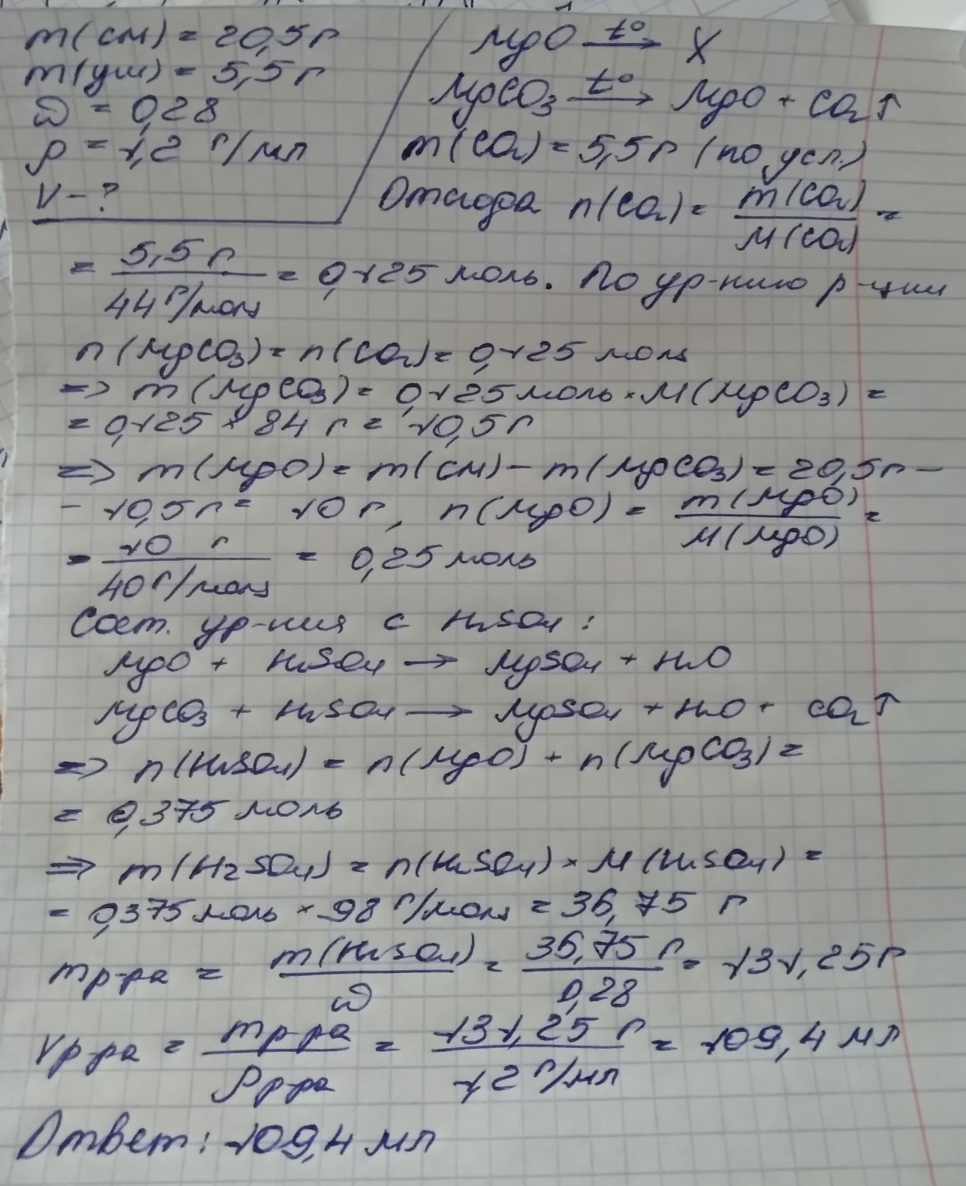 Смесь оксида магния и карбоната магния массой 20,5 г нагрели. В результате масса смеси уменьшилась на 5,5 г. Рассчитайте объем раствора серной кислоты с массовой долей 28% и плотностью 1,2 г/мл ,который необходим для растворения порошков