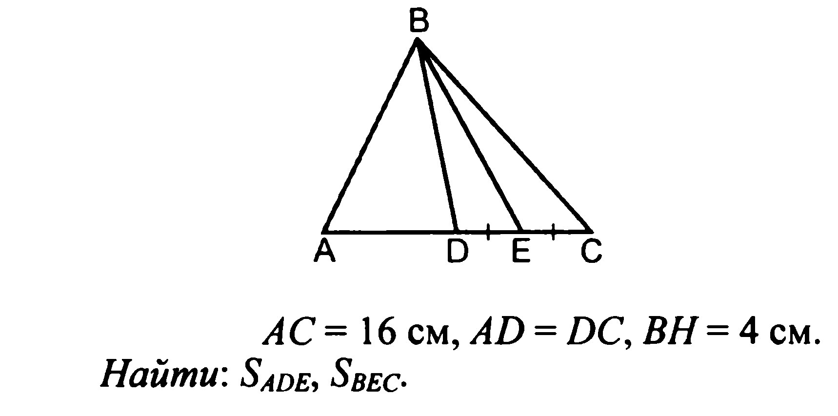 Sbde = Sbec = 1/2 * Sbcd = 1/2 * 16 = 8 (см^2)