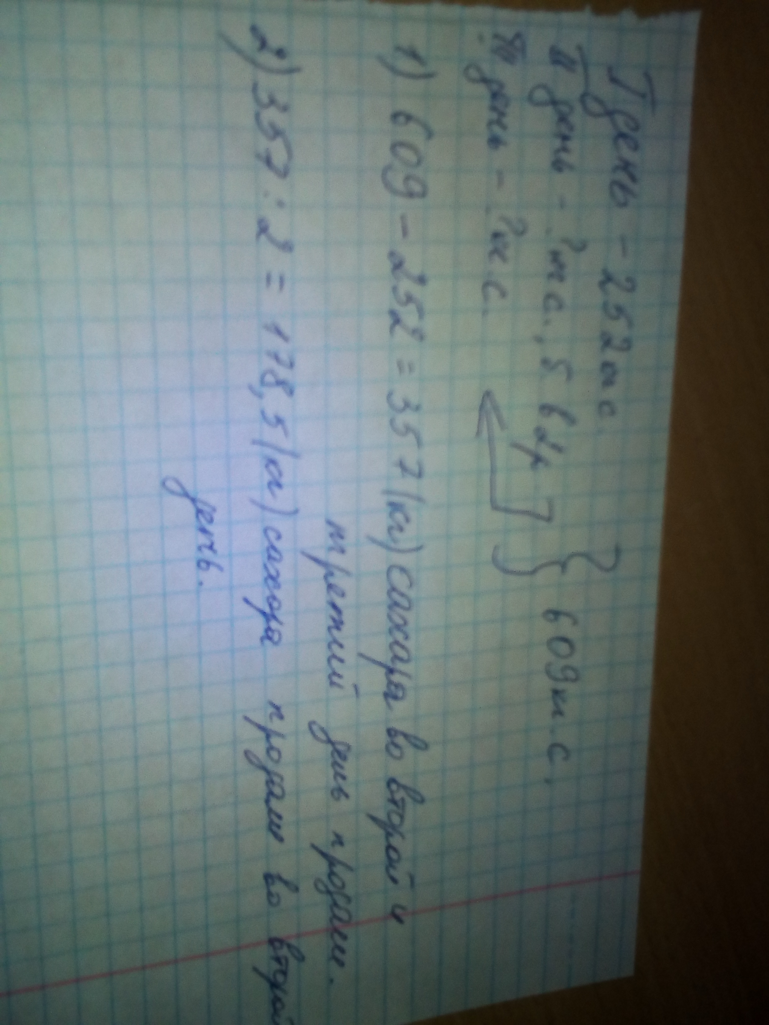 В магазине за 3 дня продали 609 кг сахара. В первый день продали 252 кг а во второй в 2 разаа больше чем третий. Сколько кг сазара продали во второй день