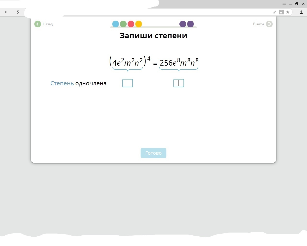 Поэтому степень одночлена справа 256e⁸m⁸n⁸ равна