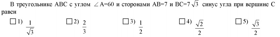 В треугольнике ABC с углом ∠A=60 и сторонами AB=7 и BC =7√3, синус угла при вершине C равен? Пожалуйста с объяснением.