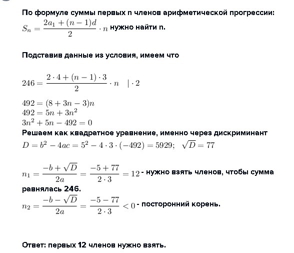перший член арифм. прогресіі =4, різниця=3. скільки треба взяти перших членів прогресіі,щоб іх сума дорівнювала 246?