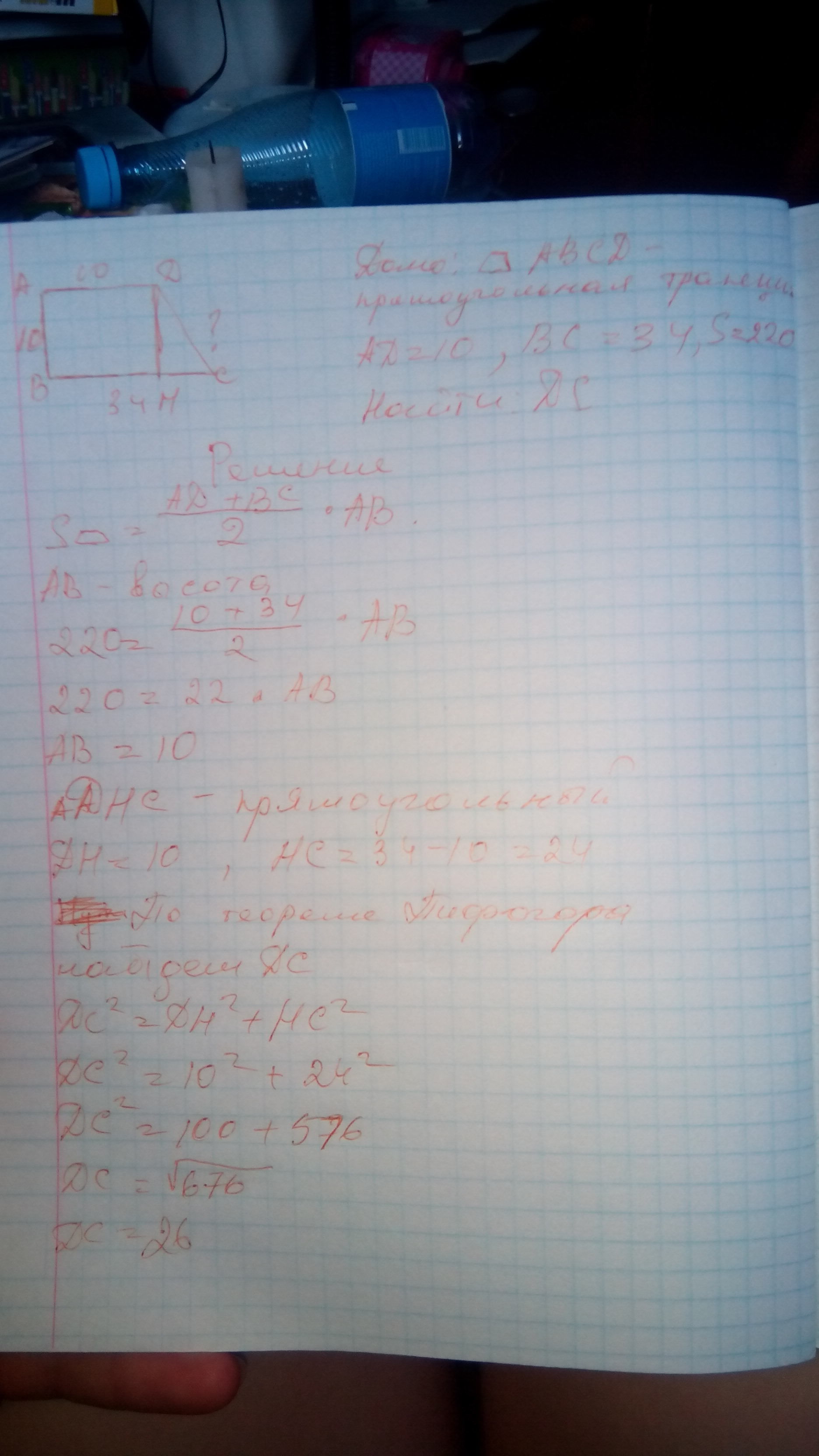 Найдите большую боковую сторону прямоугольной трапеции , если ее основания равны 10 см и 34 см , а площадь равна 220 см в квадрате, прошу помогите