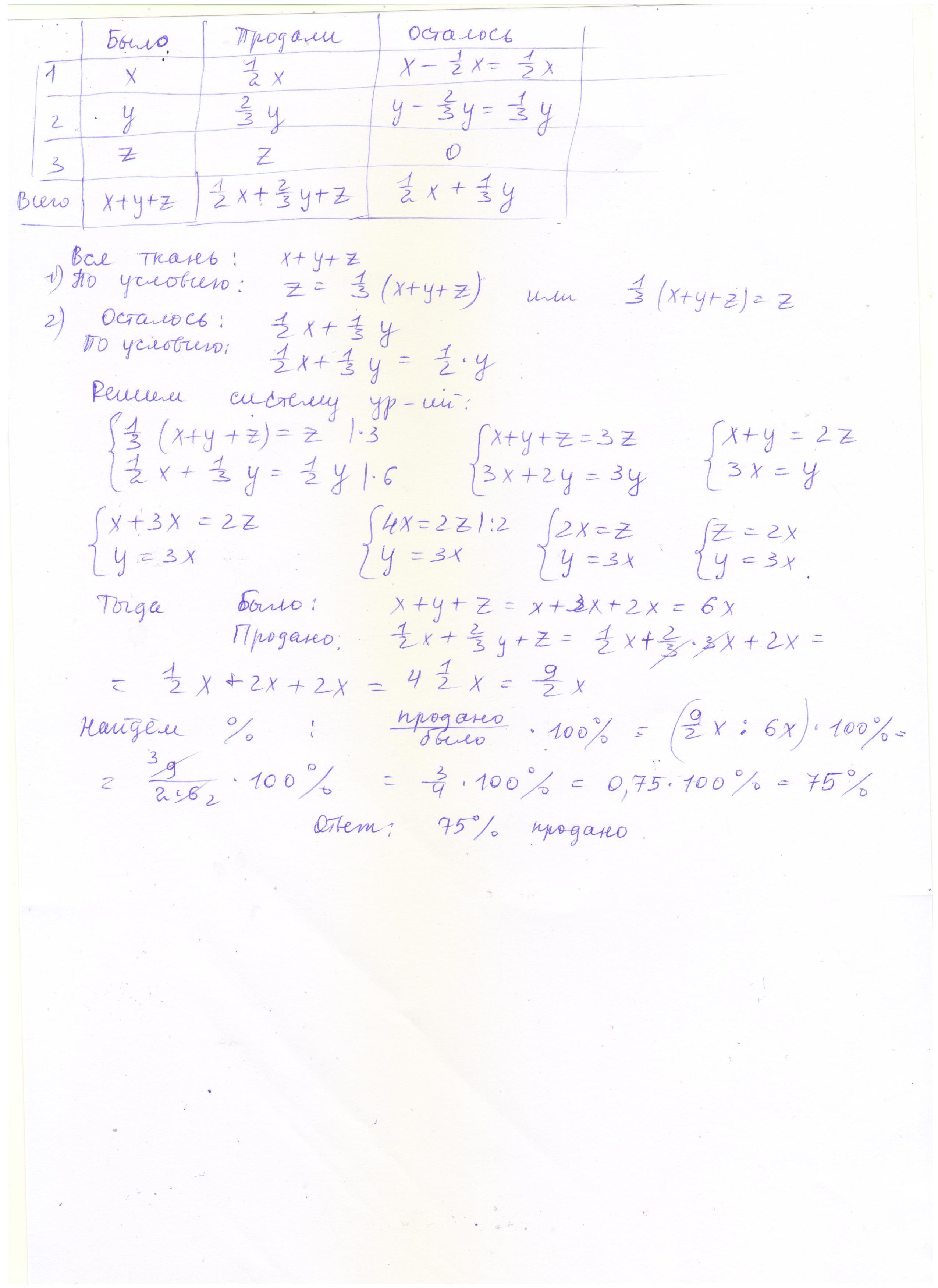 Продают три куска ткани.Из первого куска ткани продали половину,из второго -2/3,
