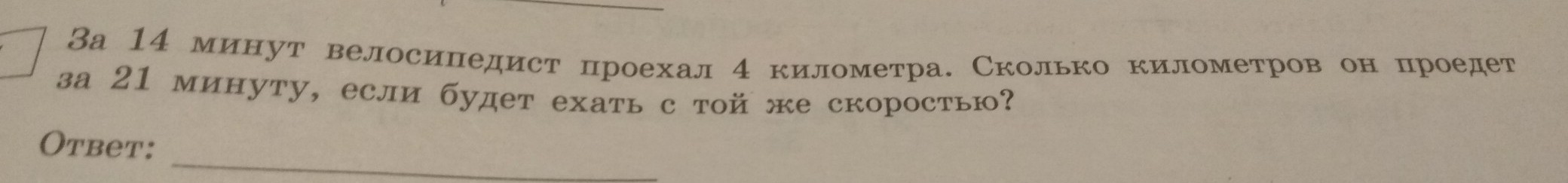 За 14 минут велосепедист проехал 4 километра. Сколько километров он проедет за 21 минуту,если будет ехать с той же скоростью