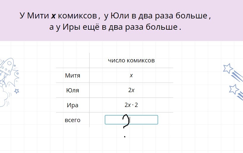 х - Митя ; 2х юля; 2х*2 -Ира = х + 2х + 2х*2 = 1х + 2х + 4х = 7х Ответ: 7х