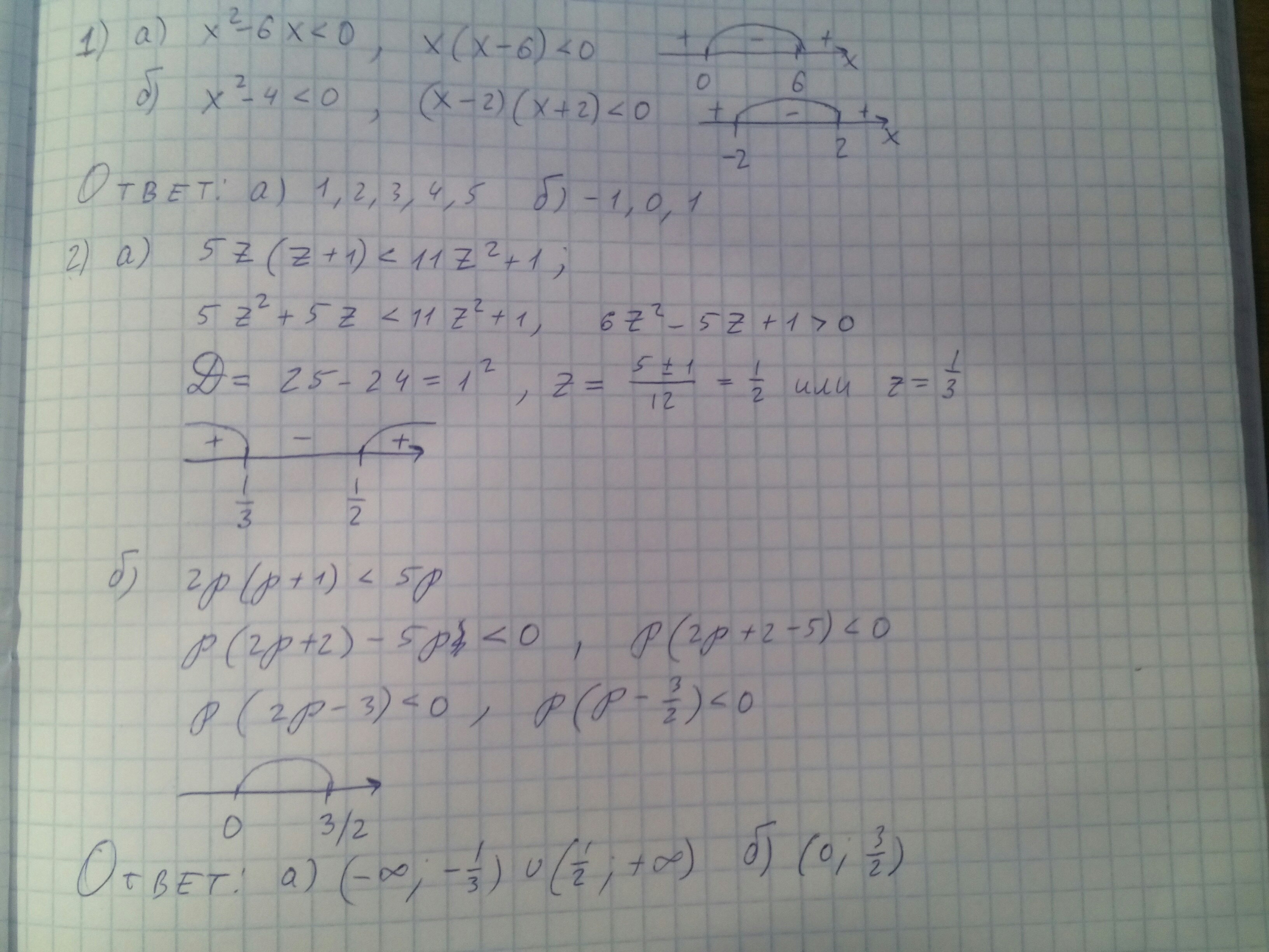 2) Найдите множество решений неравенства: а) 5z(z+1)<11z^2+1; б) 2p(p+1)<5p.