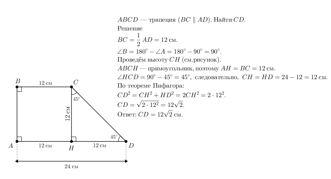 Углы при основании трапеции равны 90 и 45 градусов. Одно основание в 2 раза больше другого и равно 24 см. Найти меньшую боковую сторону трапеции.