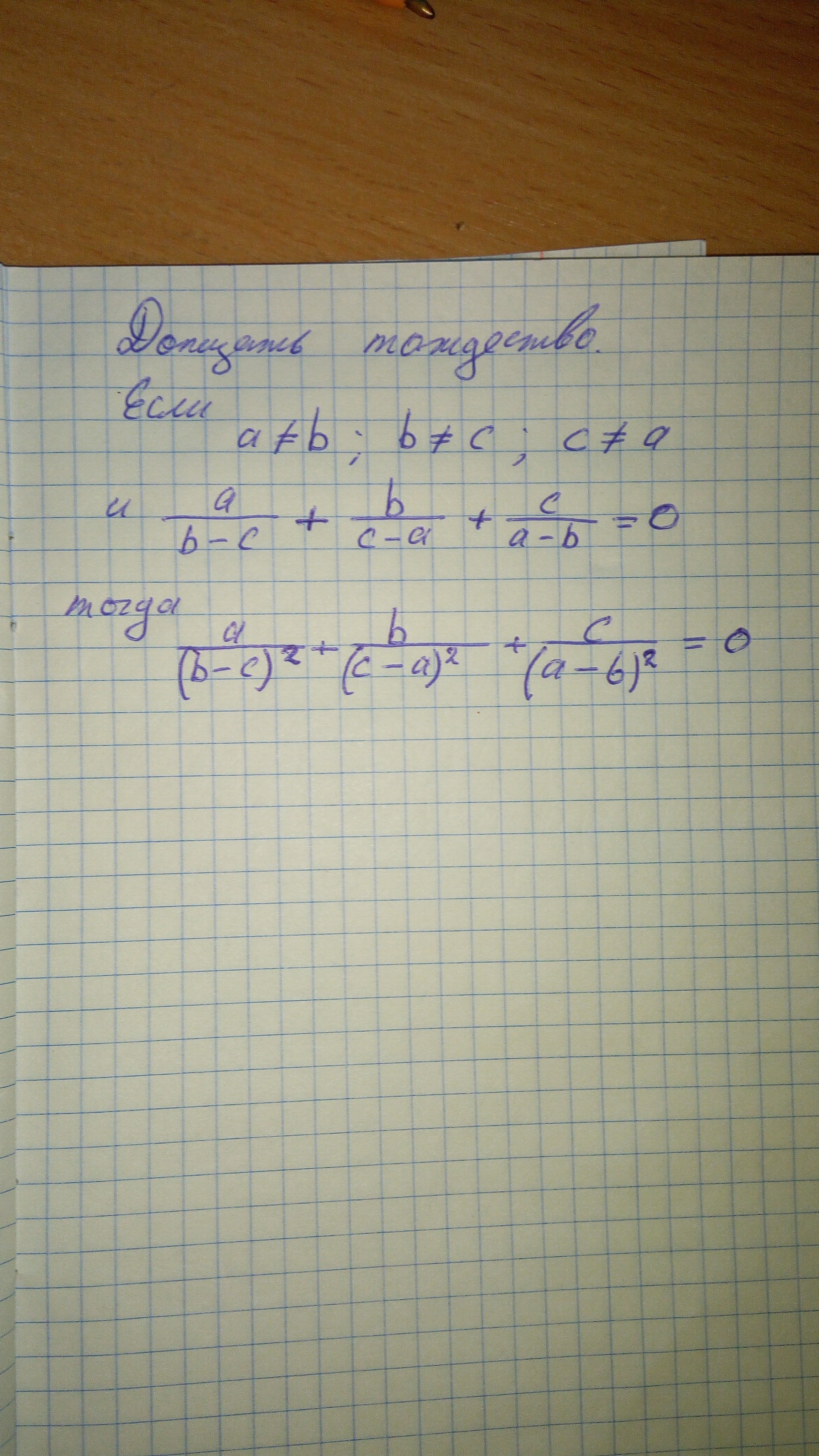 Разделим первое равенство последовательно на (b - c), (c - a) и (a - b) и сложим результаты: