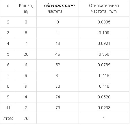 1) - количество длин букв. Абсолютная частота является целым числом и показывает, сколько раз данное значение повторяется в выборке. Сумма абсолютных частот всегда равна объему выборки.