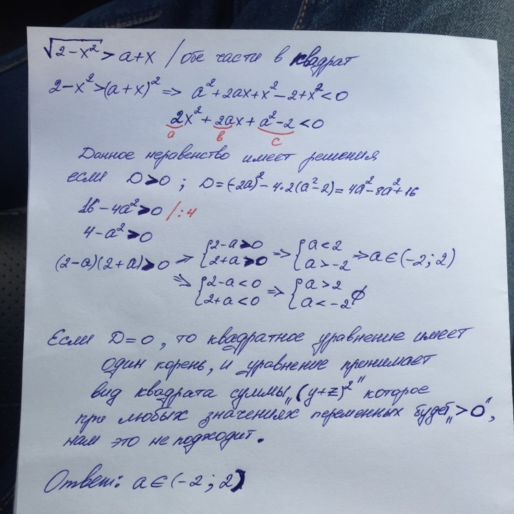 При каких значениях параметра a неравенство: 2-x^2(эта запись под корнем)>a+x имеет решения?