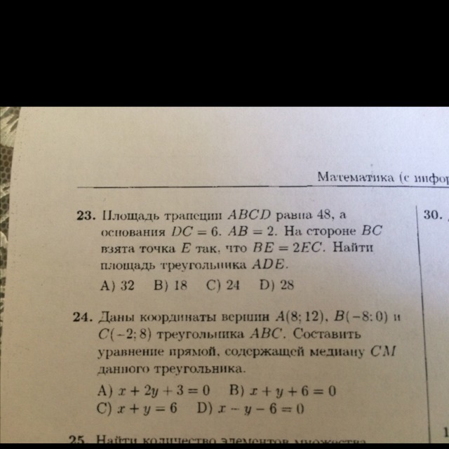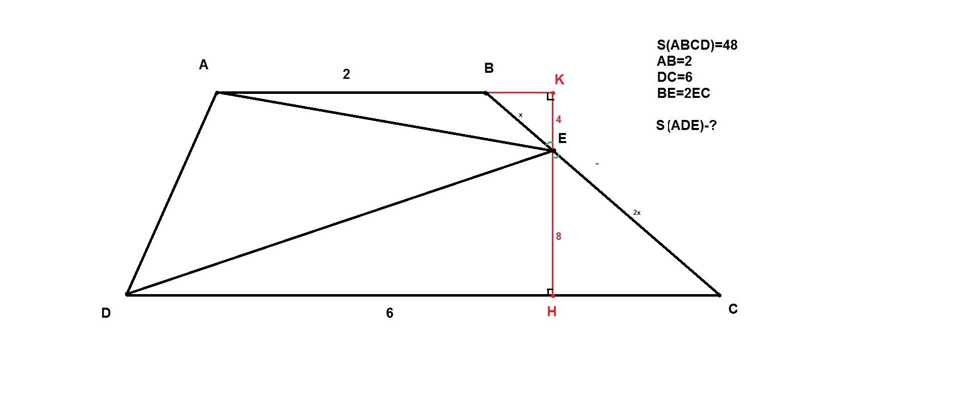 Найдем площади треугольников ABE и DEC, а затем вычтем их из площади всей трапеции и получим нужную нам площадь ADE.