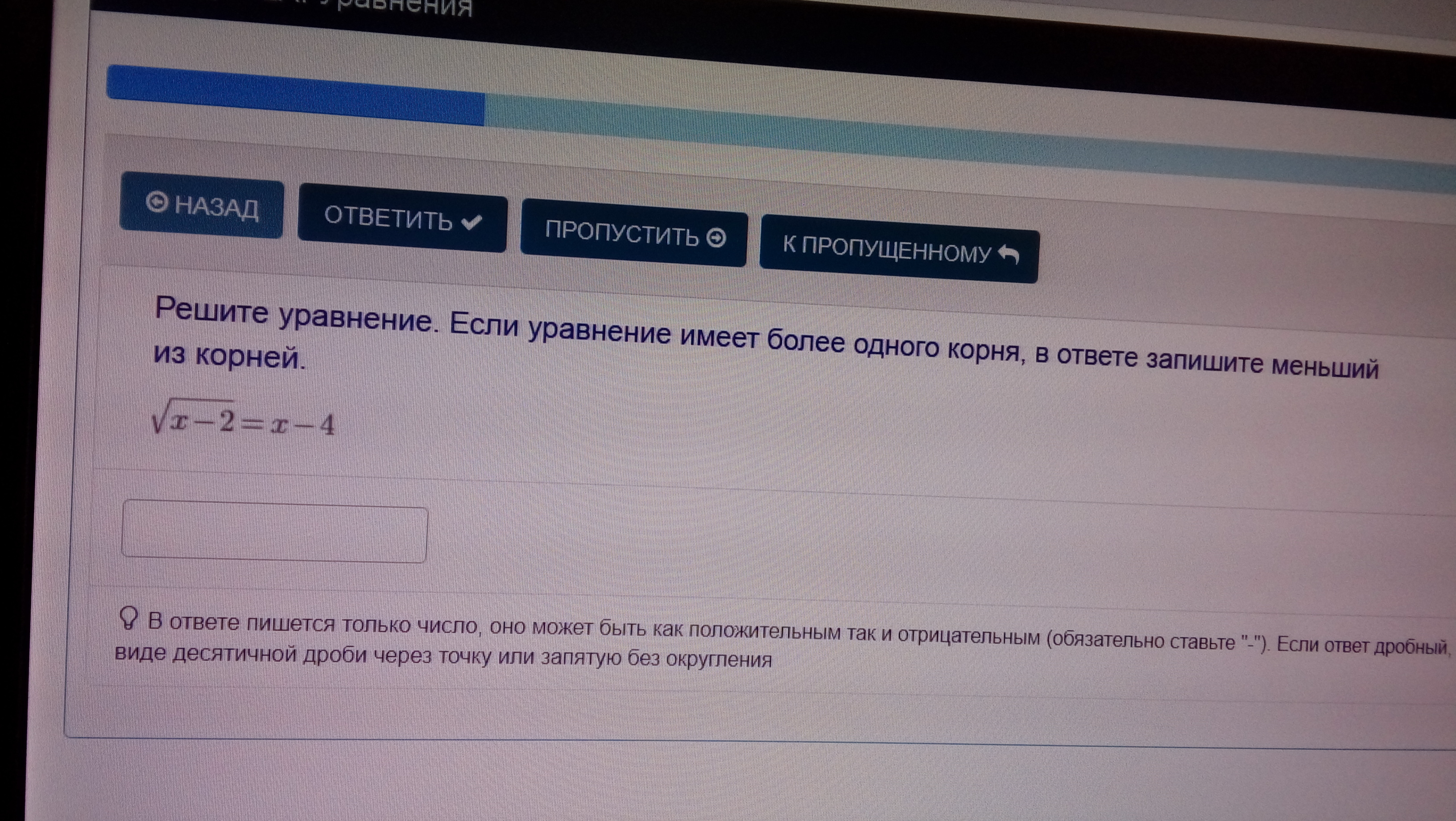 Из левой части следует, что уравнение допускает только решения, не меньшие 2. Возведём обе части в квадрат: х-2=х^2-8х+16 => х^2-9х+18=0