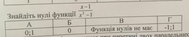 Знаменатель не может равняться нулю, то есть х^2-1 не равно 0, откуда х^2 не равно 1 и х не равно -1 и 1. Единственно возможный случай, когда функция могла бы обратиться в ноль - это х=1, но он не соответствует области допустимых значений. Следовательно, функция не имеет нулей.