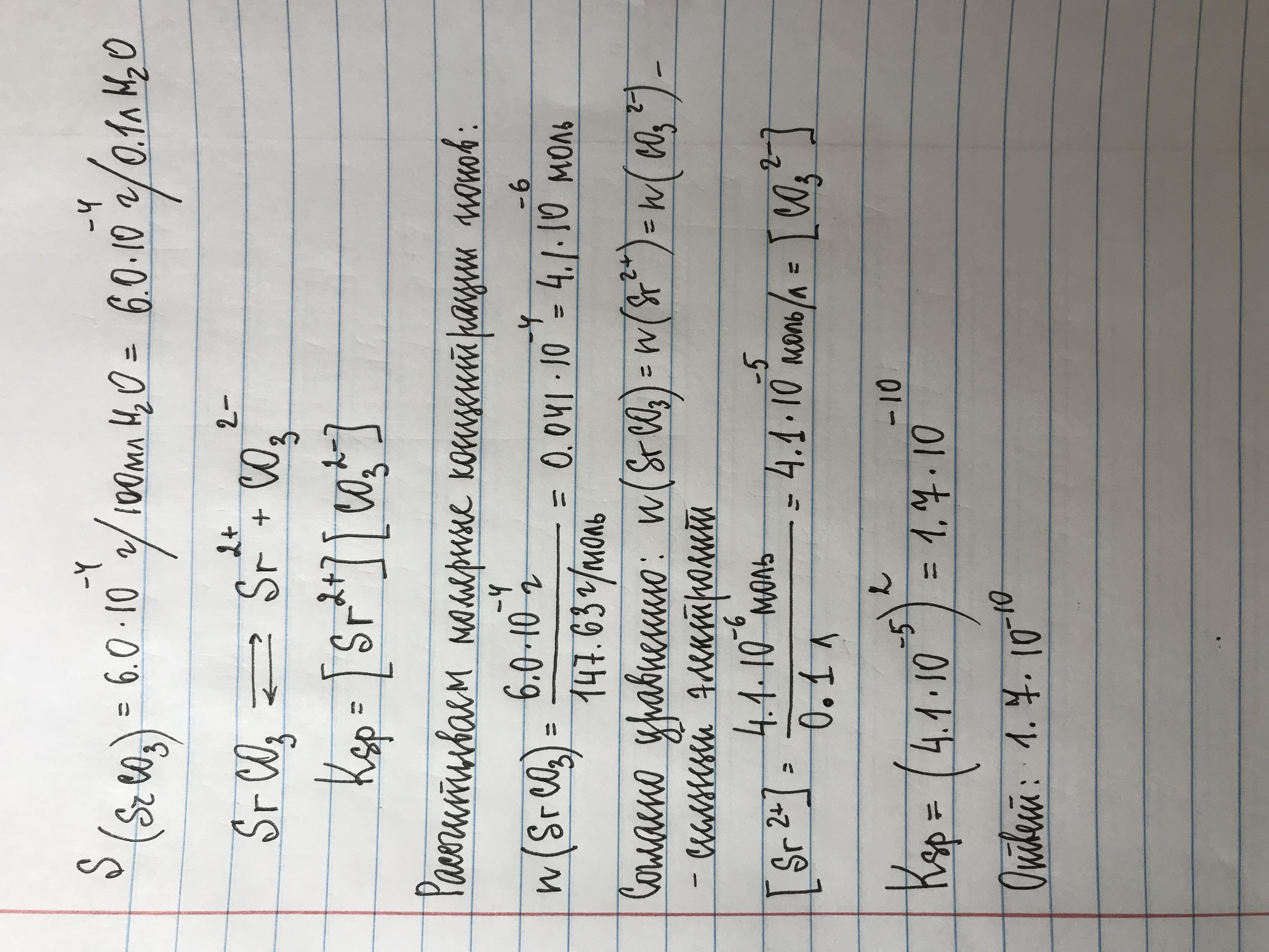 Рассчитать произведение растворимости, если в 100 мл воды растворимость составляет 6,0*10^-4 г SrCO3