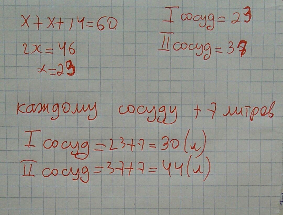 Добавили в каждый по 7 л, стало 30 и 44 л