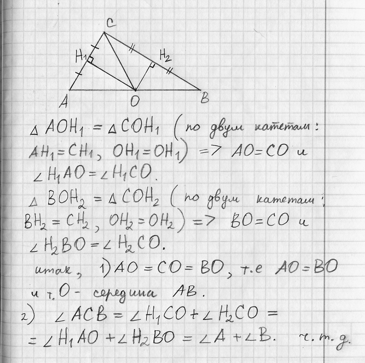 Точка O - точка пересечения серединных перпендикуляров сторон AC и BC треугольника ABC - и принадлежит его стороне AB.